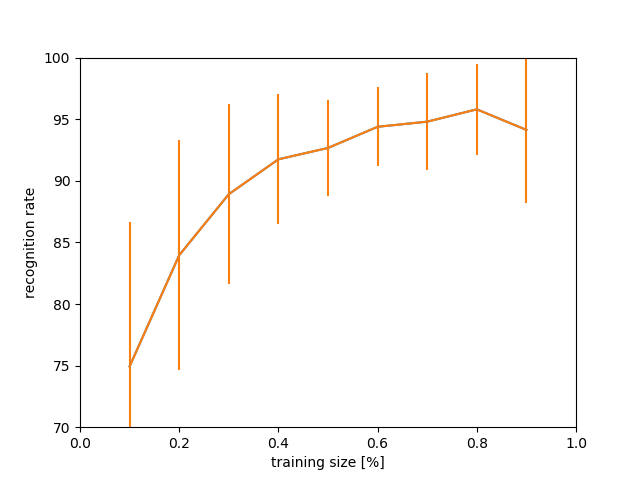 - 次にデータの分け方を半々ではなく、1対9、2対8 ... 9対1に分け、それぞれを1000回ずつ試行、平均と標準偏差を記録